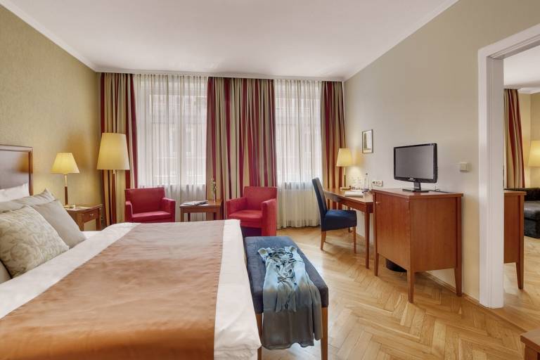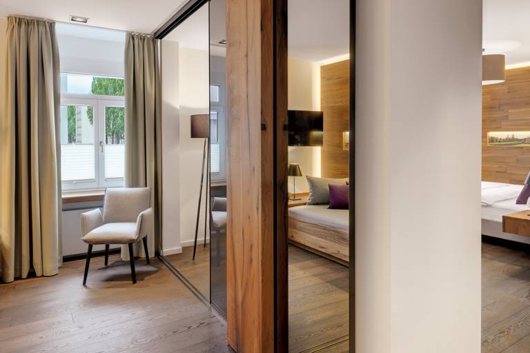 High-grade wood and top-quality materials are the signature features of our two Junior Suites. They face the quiet inner courtyard and will contribute to make your stay a perfect feel-good experience with the generously laid out daylight bathroom with wellness rain shower and bath tub as well as an iPod and iPhone-compatible sound system and a large cabinet with Nespresso machine and automatic tea maker.