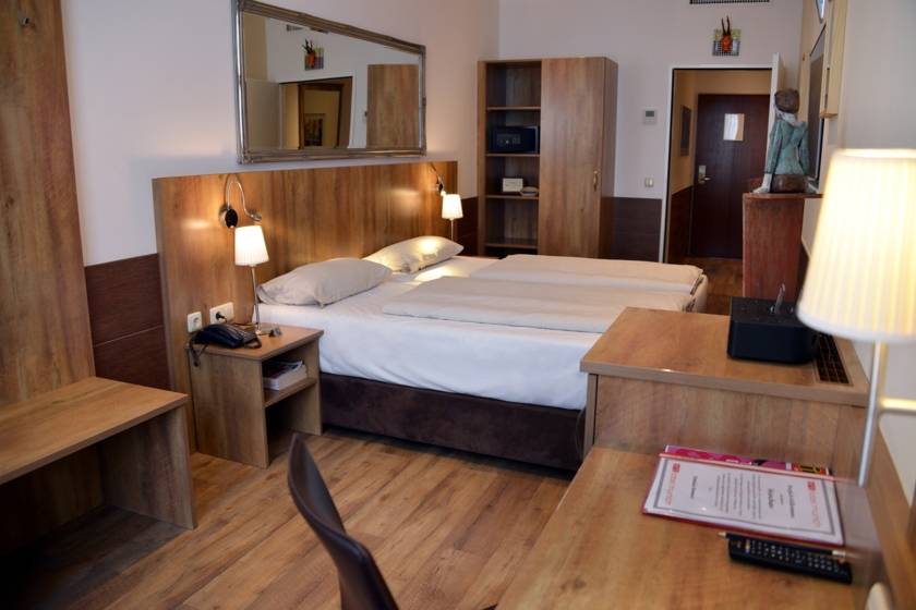RoomequipmentOur styleful furnished and air-conditioned rooms are equipped with two beds and one sofa bed, Shower/WC, hair dryer, mini bar, Safe, Sat-, cable TV, step-by-step selection telephone, Docking Station and free Wi-Fi. Wi-Fi-Use in the entire house is free of charge. The breakfast is included in the price. Room Size: 18.00 square meters