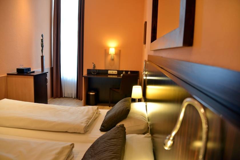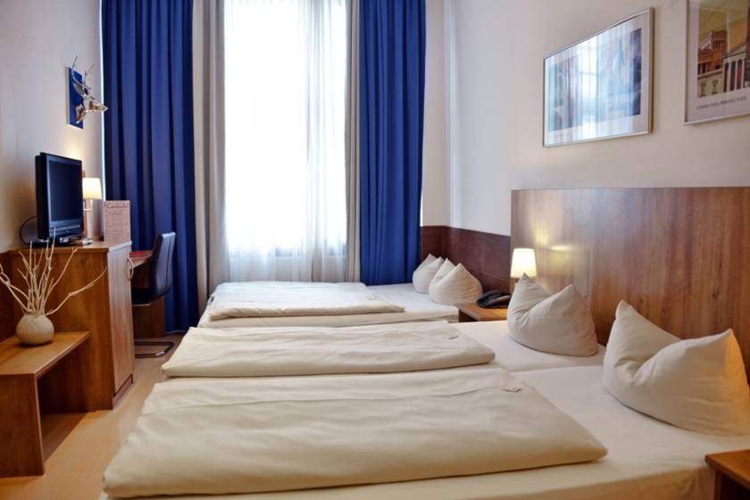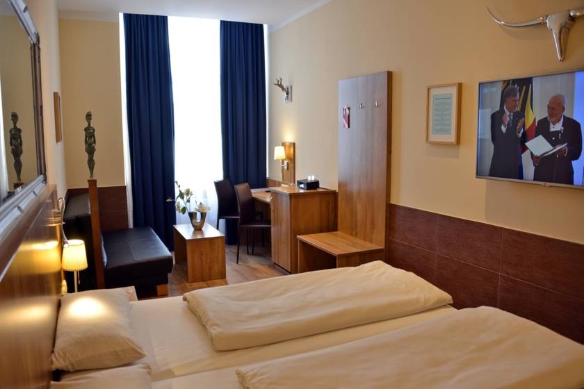 RoomequipmentOur styleful furnished and air-conditioned rooms are equipped with two beds and one sofa bed for two persons, Shower/WC, hair dryer, mini bar, Safe, Sat-, cable TV, step-by-step selection telephone, Docking Station and free Wi-Fi. Wi-Fi-Use in the entire house is free of charge. The breakfast is included in the price. Room Size: 18.00 square meters.