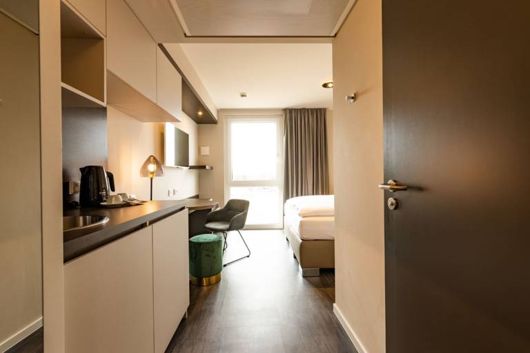 Our serviced MARVELOUS Apartment with fully equipped kitchenette offers a lot of comfort on about 19 m2: Large box spring bed Bathroom in marble look with tropical shower High-quality, fully equipped kitchenette with ceramic hob, electric kettle, fridge, microwave and branded dishes WLAN free of charge Weekly cleaning