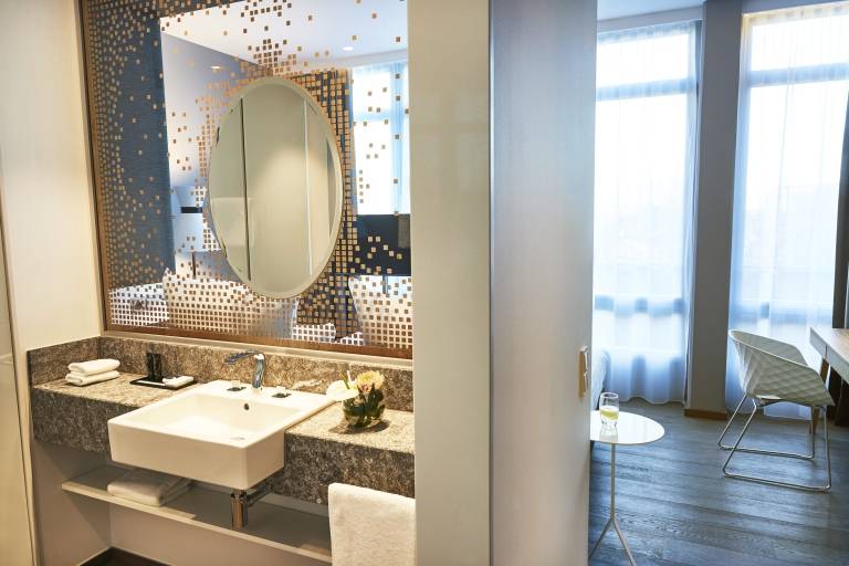 Our very special Junior Suites impress through their spaciousness and elegant design purism. · 47 sqm · partly view to the Alps · one-room suite with lounge area · one double bed or two separate single beds · air conditioning · floor to ceiling windows · antiallergic real wood floors · bathroom with shower or tub · minibar · coffee machine and water heater · free Wi-Fi · smart TV