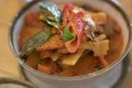 A place where you can easily get carried away to a Thai street food market, thanks to the lovingly designed setting, the soundscape of clattering woks, Thai pop music and the cheerful interactions of the exclusively Thai team. The illusion is completed once the food is served. Geang pa, for example, a red curry that smells of kaffir lime leaves, Thai basil and lemongrass. Or Sate moo, grilled pork skewers served with a small ball of sticky rice and a sweet and tangy chilli sauce.