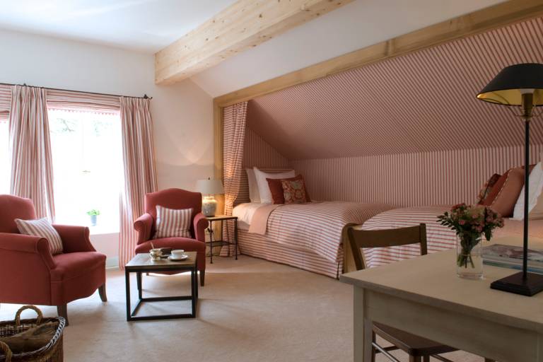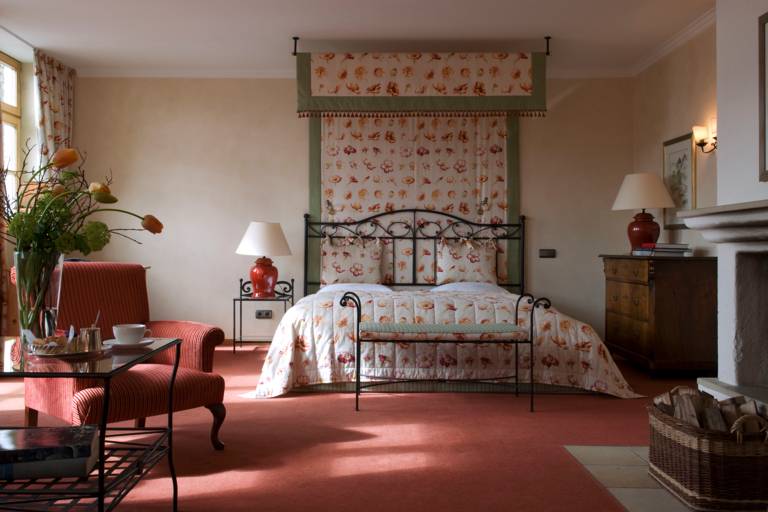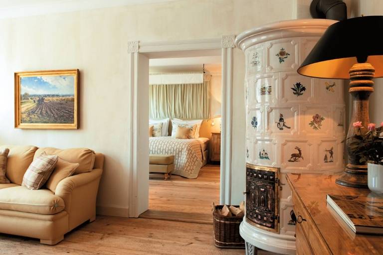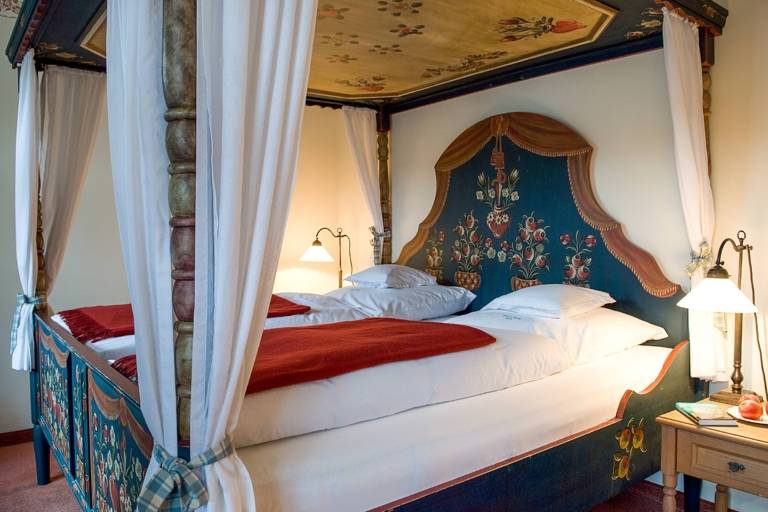 Luxurious Junior Suite kept in Bavarian style, located in the historical annex, 45 - 65 m² with fireplace or tiled stove, Double Bed, Marble Bath with shower or bathtub, bathrobe & slippers, hair dryer, safe, minibar, telephone, flat screen SAT-TV, Sky Sports, WiFi access, large sitting area with spruce wooden floor or carpet.