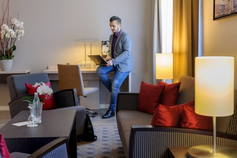 At the 4-star Mercure Hotel München Süd Messe, you can choose between Standard Rooms with single bed, twin beds, queen-size bed or queen-size bed and sofa. Our Privilege Rooms have a queen-size bed and the Privilege Suite has a king-size bed and sofa. We have one specially adapted room for guests with reduced mobility. The 185 rooms are air conditioned and have free WIFI. A child up to 12 years can sleep in their parents'room for free. Pets welcome.