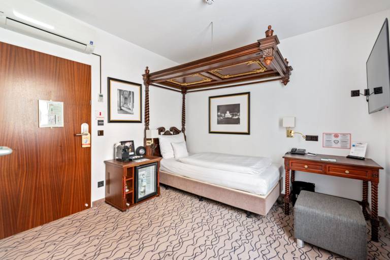 Welcome to our single room! Our single room offers you everything you need for a comfortable and relaxing stay. Always enjoy pleasant temperatures thanks to our air conditioning and stay connected with our high-speed WiFi. Experience undisturbed peace and quiet thanks to our high-quality soundproofing. Your safety is important to us, which is why we also offer you a safe for your valuables. And our allergy-friendly bed linen ensures a restful night's sleep. Book now and experience the perfect mix of comfort and convenience in our hotel room!
