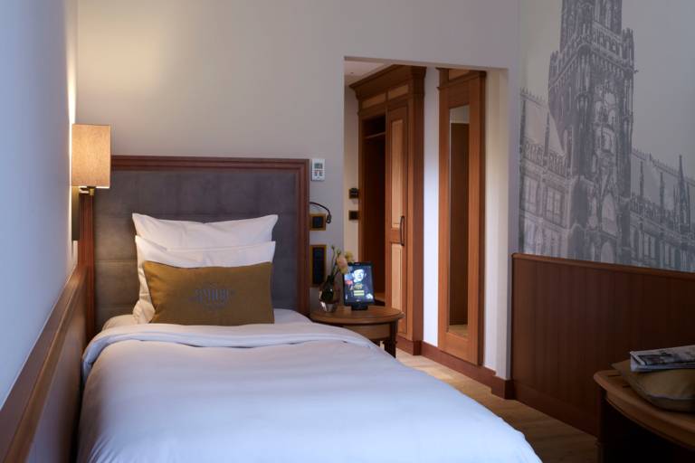 Our Classic single rooms (12-15m²) feature extra-long single beds (1.00 m x 2.10 m) that offer the ultimate in sleeping comfort. The view from the window reveals historic Munich or the world-famous Hofbräuhaus. Create the ideal room conditions with an adjustable climate control system, and get a good night's sleep thanks to the sound-insulated windows.