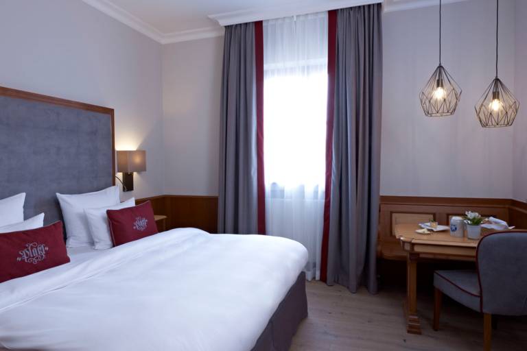 Our Deluxe Double Rooms offer not just a lot of space (28m²) but also double beds for added comfort. Looking out the window, enjoy the view of Munich's historic city or the beautiful courtyard of Platzl Hotel Munich. An adjustable climate control system allows you to set the temperature to your comfort level, while sound-insulated windows ensure a good night's sleep.