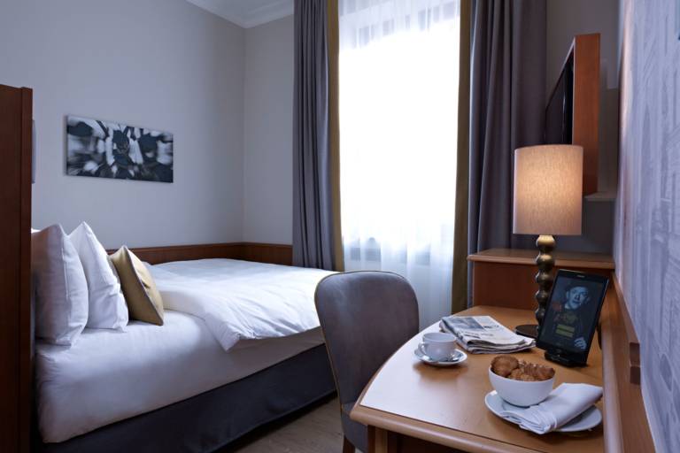Our small double rooms (21m²) feature one queen-size-bed (1.60 m x 2.10) for the ultimate in space and sleeping comfort. The view from the window reveals historic Munich or the world famous Hofbräuhaus. Modern sound-insulated windows ensure a good night's sleep. Adjust the temperature to your own requirements using the adjustable climate control system.