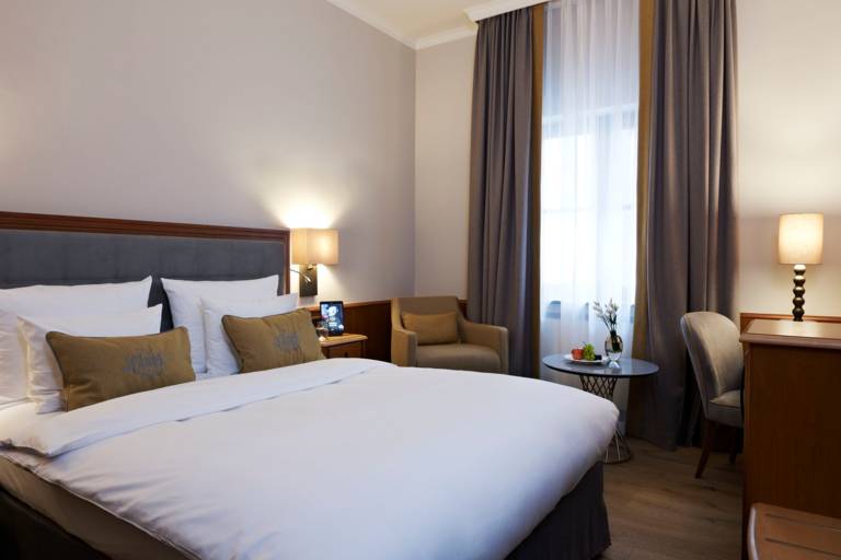 Our popular oversize queen bedded (1.60 m x 2.10 m) room features 15sqm, a bottle of free mineral water per stay, offering also a wide range of amenities such as 32"flatscreen SAT-TV with international programs, Entertainment-System with HD Blockbuster (at a charge), radio, ISDN phone with personal voice mail system, free LAN and high speed WiFi, safe (laptop size), a private bath with shower, hairdryer, bathrobe and slippers and a minibar. All rooms are equipped with soundproof windows and provide individually adjustable air conditioning. This room is facing to street or inner courtyard.