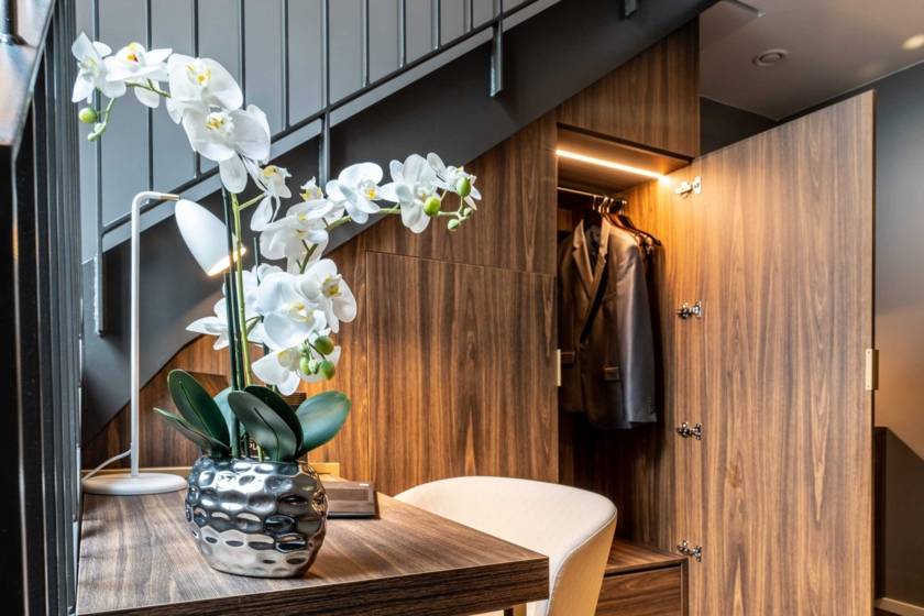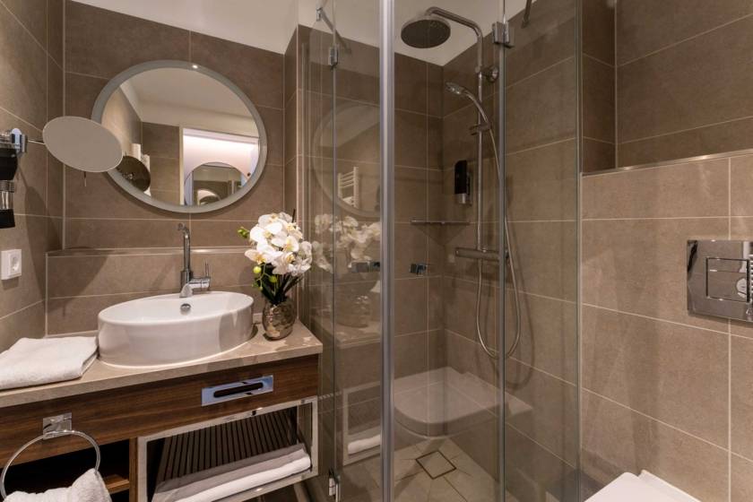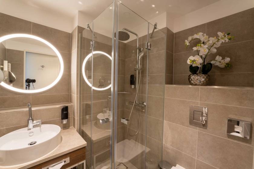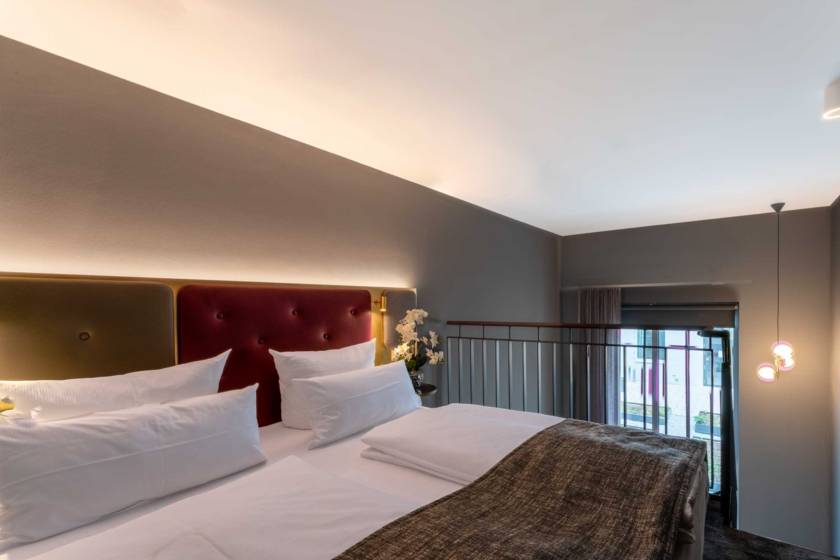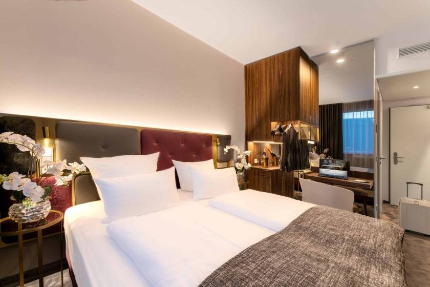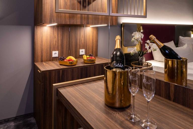 Size: 33 m² - Bedroom with living area Room facilities: King-size bed - Savoy box spring beds, Luggage rack, wardrobe, soundproof windows, desk, desk chair, reading lamp, bedside tables, carpet floor Bathroom facilities: Hairdryer, make-up mirror, towels, bathroom amenities, walk-in shower Technical facilities: individually adjustable air conditioning, free high-speed WiFi, telephone, 39 inch smart TV Extras: mini fridge and Nespresso coffee machine