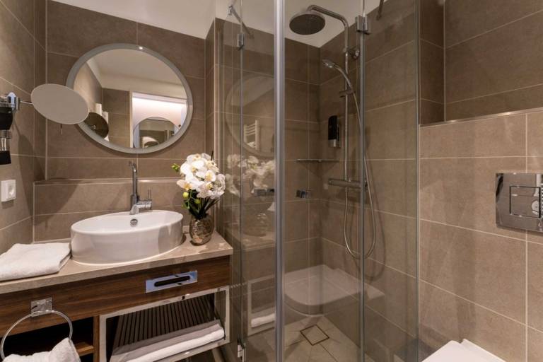 RoomequipmentYour personal retreat: our premium triple rooms have been lovingly designed to provide the perfect setting for quality time together in stylish surroundings. Each room features a comfortable double bed and an additional sofa bed for one person, a desk, a flat-screen TV, a coffee and tea station, a safe, a self-filling minibar and an ironing board and iron. The en-suite bathroom is fitted with a walk-in rain shower, WC, make-up mirror and hairdryer. High-speed Wi-Fi is included.