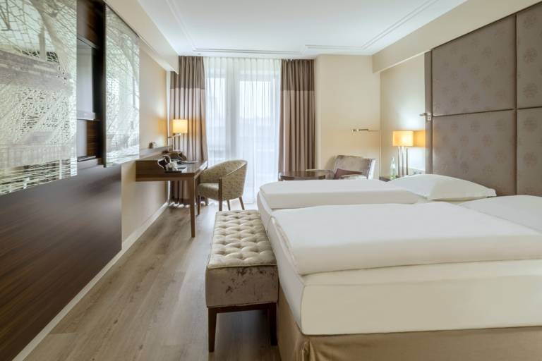 Spacious and bright rooms/suites, most of them with their own balcony/loggia. High-quality equipment, innovative technology and the comfort you expect: minibar, telephone, WIFI, Sky TV, shower/tub, hair dryer, workspace.
