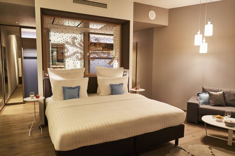 Our very special Junior Suites impress through their spaciousness and elegant design purism. · 47 sqm · partly view to the Alps · one-room suite with lounge area · one double bed or two separate single beds · air conditioning · floor to ceiling windows · antiallergic real wood floors · bathroom with shower or tub · minibar · coffee machine and water heater · free Wi-Fi · smart TV