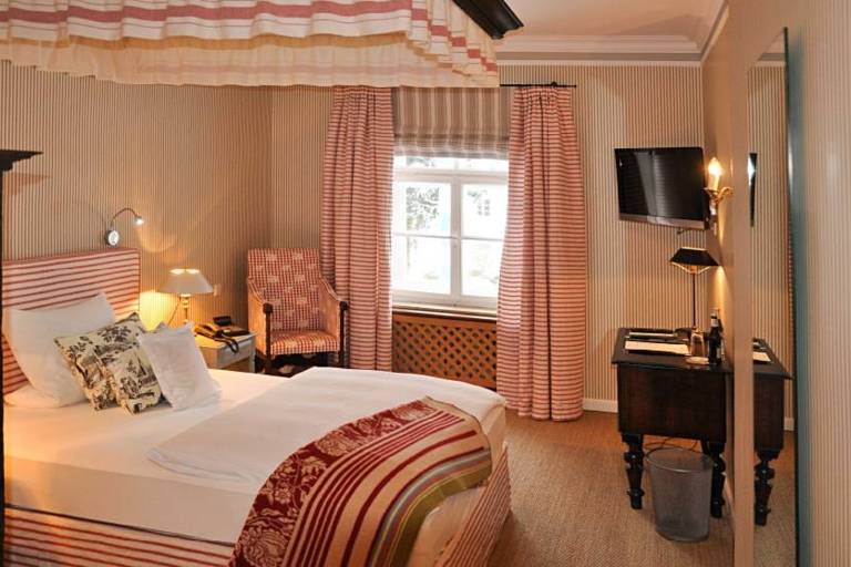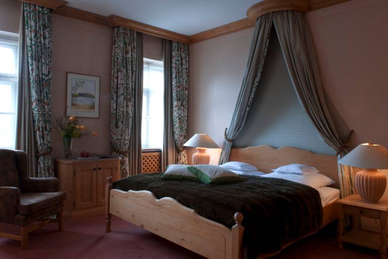 Luxurious Non-Smoking Double Room kept in Bavarian style, located in the historical annex, 40 - 49 m² with fireplace or tiled stove, Double Bed, Marble Bath with shower or bathtub, bathrobe & slippers, hair dryer, safe, minibar, telephone, flat screen SAT-TV, Sky Sports, WiFi access, spruce wooden floor or carpet and sitting area.