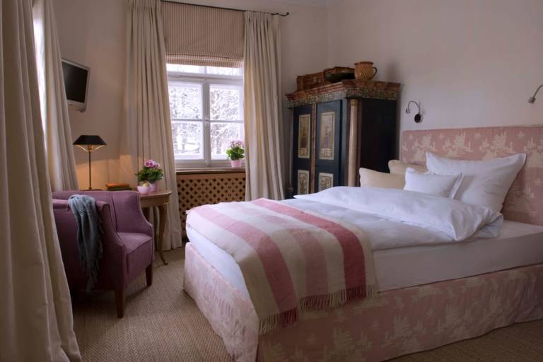 Spacious Non-Smoking Double Room kept in Bavarian style, located in the historical mansion, 40 - 43 m² with Double Bed, Marble Bath with shower or bathtub, bathrobe & slippers, hair dryer, safe, minibar, telephone, flat screen SAT-TV, Sky Sports, WiFi access, spruce wooden floor and sitting area.