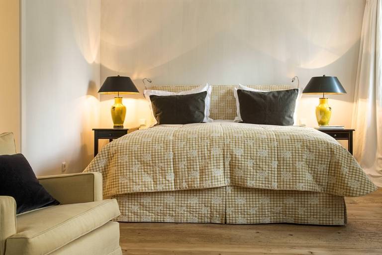 Luxurious Junior Suite kept in Bavarian style, located in the historical annex, 45 - 65 m² with fireplace or tiled stove, Double Bed, Marble Bath with shower or bathtub, bathrobe & slippers, hair dryer, safe, minibar, telephone, flat screen SAT-TV, Sky Sports, WiFi access, large sitting area with spruce wooden floor or carpet.