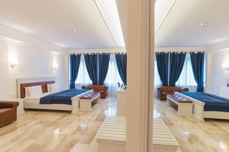 Our generous deluxe double rooms will give you that little something extra during your stay with a room size of over 25 square metres. Our classic baroque style executive rooms ensures your comfort with a large bed, a sofa and a marmor bathroom with a beautiful bathtub and an extra is also available for those who are travelling with the family or group of friends. • High quality, comfortable King sized Bed (180x200) • Wardrobe • Electrically operated blinds • Flat screen monitor • Fridge • Free WLAN • Non-smoking room • Smoke detector • Desk • Phone • Safe • Tea Maker • Chesterfield Sofa The bathroom in our deluxe double room consist the following equipment: • Spacious marble bathroom with a bath tub • Large mirrors • Height-adjustable cosmetic mirror • Marble floor heating • Electrically operated blinds • Hair dryer • Free care products