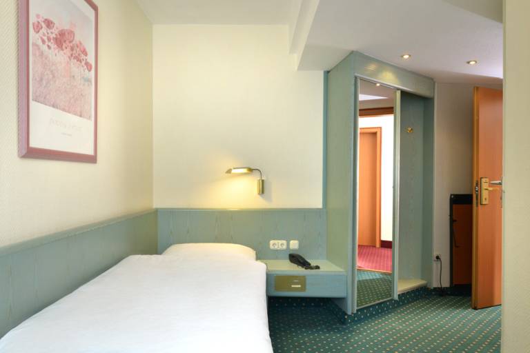 Non-smoking single room facing to the front-/sidestreet, no air condition, 15m², with one big bed (1.40 x 2.00 m) / 100% non-smoker / iPad room safe. Compact Basic fittings. Ideal for a stopover. You stay in our smallest rooms at a reasonable price. They are not recommended on long stays.