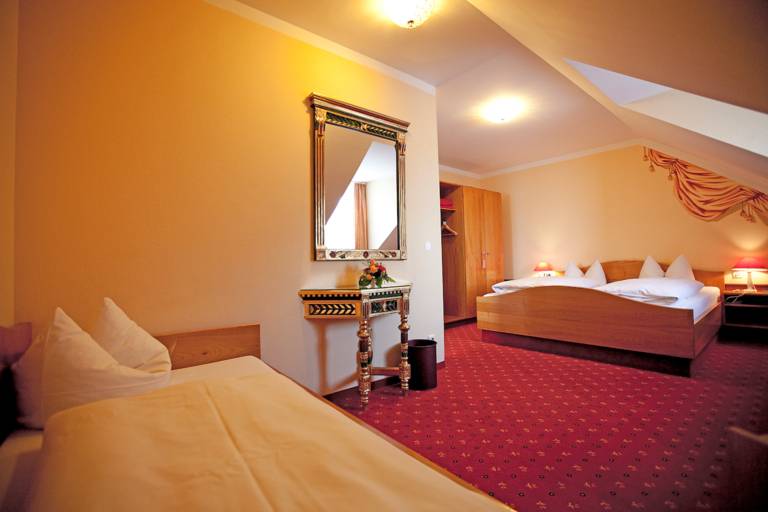 Room Size 40 sqm - Fresh and newly designed in a traditional „Bavarian Alm Style“ are the Junior Suites. They include 1 double bed (2 Box-Spring-Beds, each 1m x 2m), 2 bunk beds for the children ( each bed 0,90m x 2m) as well as a sofa-bed for two (1,80m x 2m ). These guest rooms are equipped with new box-spring-beds, a new sofa-bed, walk-in wardrobe full-length mirror, modern Flat-TV with international channels, telephone with wake-up facility, work desk, walk-in rainshower, WC, make-up mirror, hairdryer, High Speed Wireless Internet access. Complimentary water (1x 0,7 l per night) in your room.