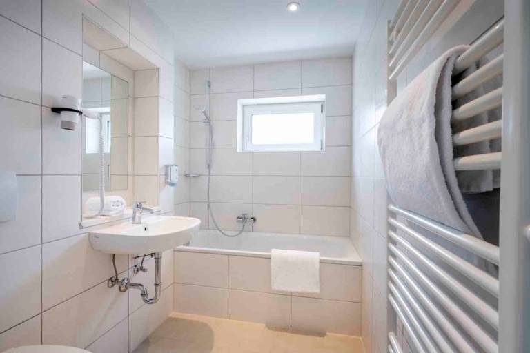 In your 25m² hotel room in Munich you can expect a box spring bed, a 55 inch 4 K TV with national and international programs, including five Sky programs. In addition to radio and telephone, you also have free access to the Internet via WIFI. The room also has a safe. The bathroom is equipped with hairdryer and cosmetic mirror.