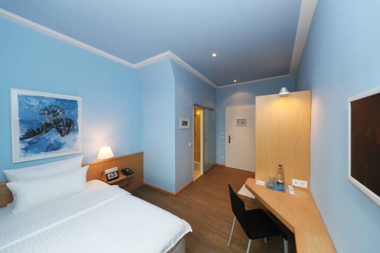 Special quietness (even with open windows) on 16 sqm, wide single bed (120cm), bathroom with large shower, desk, view towards the inner courtyard, air conditioning available on request.