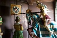 Durante la nostra visita, tutta la corte fa bella figura, come anche questo paggio con il suo cappello color verde erba e la giubba rossa. Solo di recente tutte le figure sono state rimosse e hanno ricevuto una nuova mano di colore, anche i bottai situati più in basso. Purtroppo questi non li abbiamo potuti fotografare: per farlo a distanza ravvicinata, Frank si sarebbe dovuto calare fuori dalla torre. Non eravamo preparati per questo; di seguito però vogliamo raccontare brevemente la loro storia. I bottai sono coloro che praticano l’arte della costruzione delle botti. Dopo una grave epidemia di peste nel 1517, si dice che siano stati i primi a scendere di nuovo in strada e ad allietare la popolazione con la loro danza. La danza del bottaio  di Monaco di Baviera (Schäfflertanz) viene ancora eseguita ogni sette anni (ultimo appuntamento nel 2019) da veri ballerini, in molti luoghi della città.
